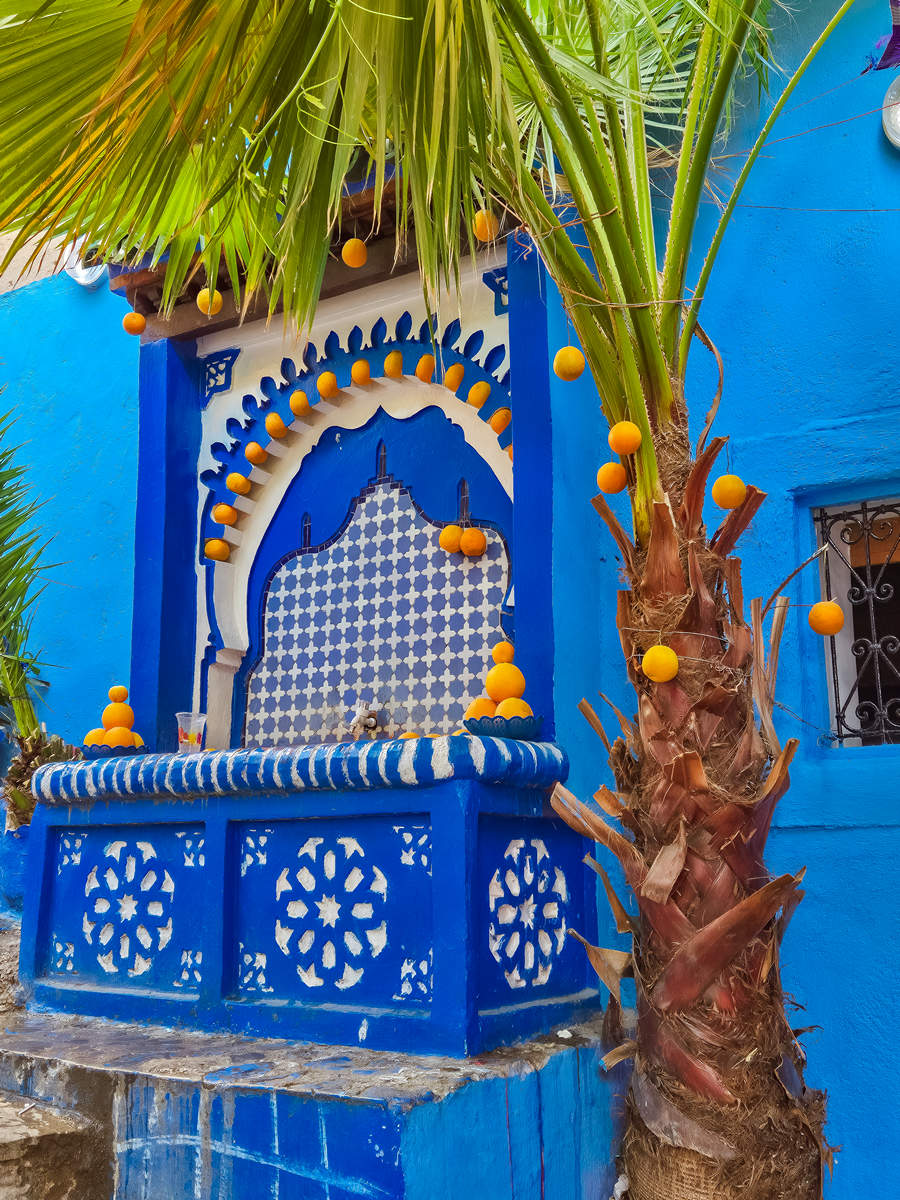 Der Platz ist von blau-weißen Häusern umgeben und besitzt einen hübschen kleinen Brunnen. Viele Einheimische sitzen hier oder unterhalten sich – perfekt, um das authentische Alltagsleben von Chefchaouen einzufangen. Hier entstehen authentische Bilder, die weniger inszeniert sind und die den Charakter von Chefchaouen widerspiegeln.