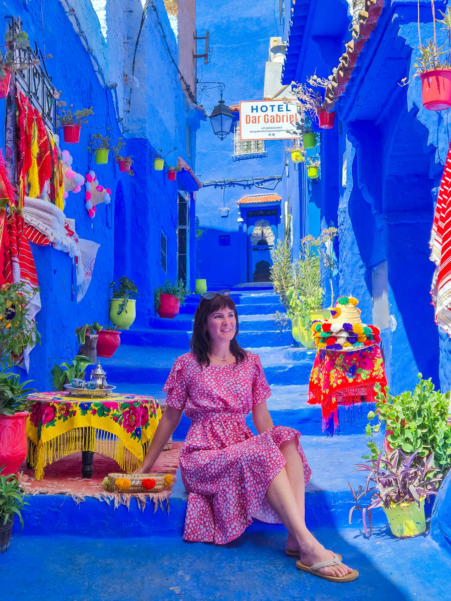 In vielen Straßen von Chefchaouen wirst du auf bunt dekorierte Ecken stoßen, die speziell für Touristen geschmückt werden. Tagsüber hängen die Einheimischen bunte Tücher, Blumentöpfe, Strohhüte mit farbigen Bommeln und kleine Möbelstücke heraus, um Fotokulissen zu schaffen.