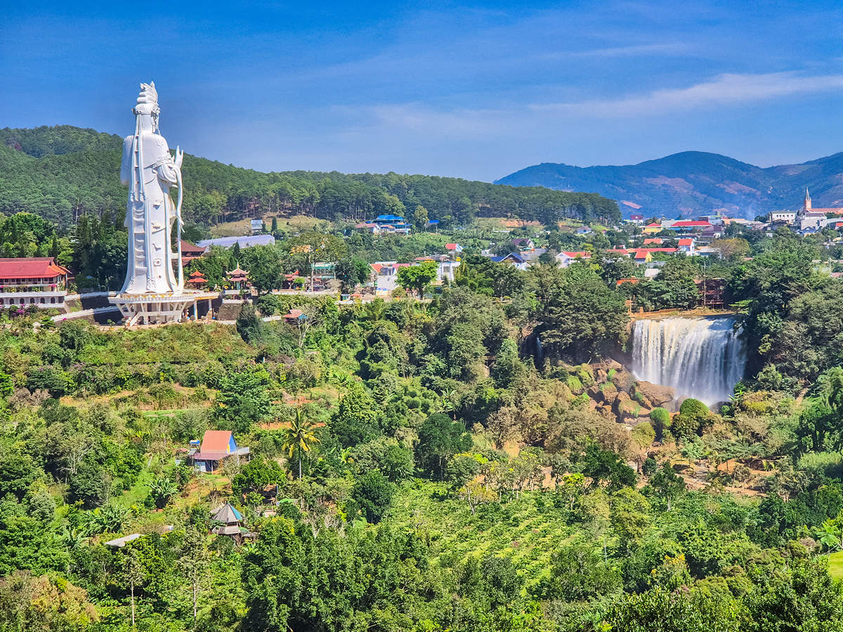 Unweit des Elephant Waterfalls liegt die Linh An Tu Pagode und hier steht eine der beeindruckendsten Statuen der Region – die Guanyin-Buddha-Statue.
