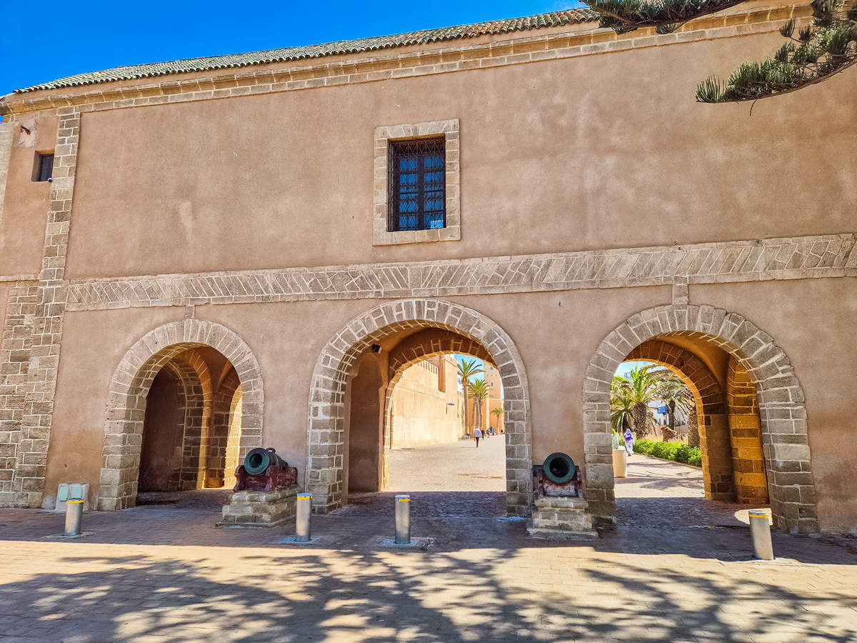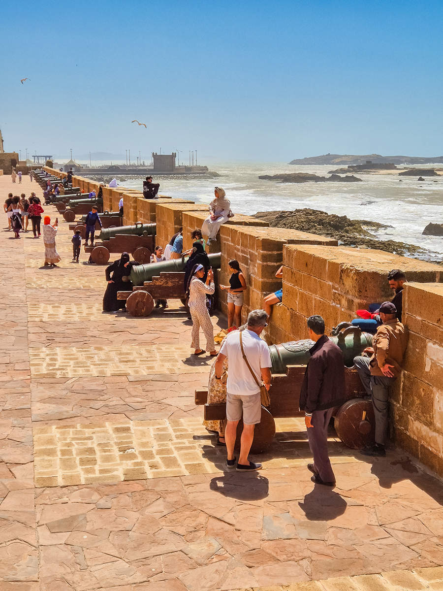 Gleich neben der Bastei befindet sich die Skala de la Ville, der vielleicht schönste Teil der Stadtmauer. Hier reihen sich jahrhundertealte Kanonen aneinander (manche stammen aus dem Jahr 1743), die einst der Verteidigung dienten. Der Ausblick auf den Atlantik und die raue Küste ist spektakulär und gehört zu den absoluten Highlights von Essaouira.