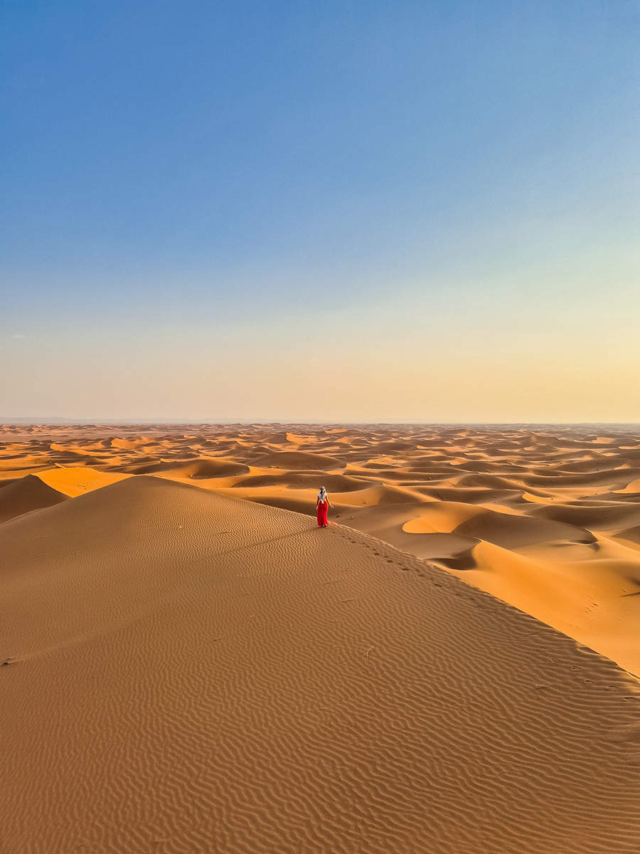Von Zagora aus sind es nur etwa 1,5 Stunden bis M’Hamid El Ghizlane, dem letzten kleinen Ort vor der endlosen Sahara. Schon auf der Fahrt merkst du, wie sich die Landschaft verändert: Palmen weichen Sand und Geröll, die Sonne brennt intensiver, und die Straßen werden einsamer.