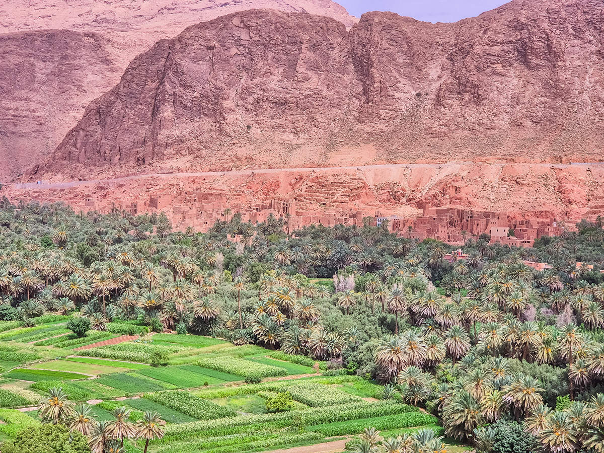 Noch bevor du die Schlucht selbst erreichst, solltest du unbedingt an den Aussichtspunkten entlang der Straße in Tinghir anhalten. Es gibt etwa drei Stellen am Straßenrand, von denen du einen atemberaubenden Panoramablick über die Palmenhaine, auf das alte Lehmdorfviertel mit seinen traditionellen Kasbahs und natürlich auf die umliegenden Berge genießen kannst.