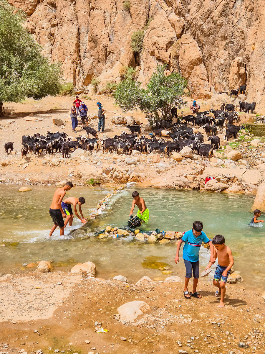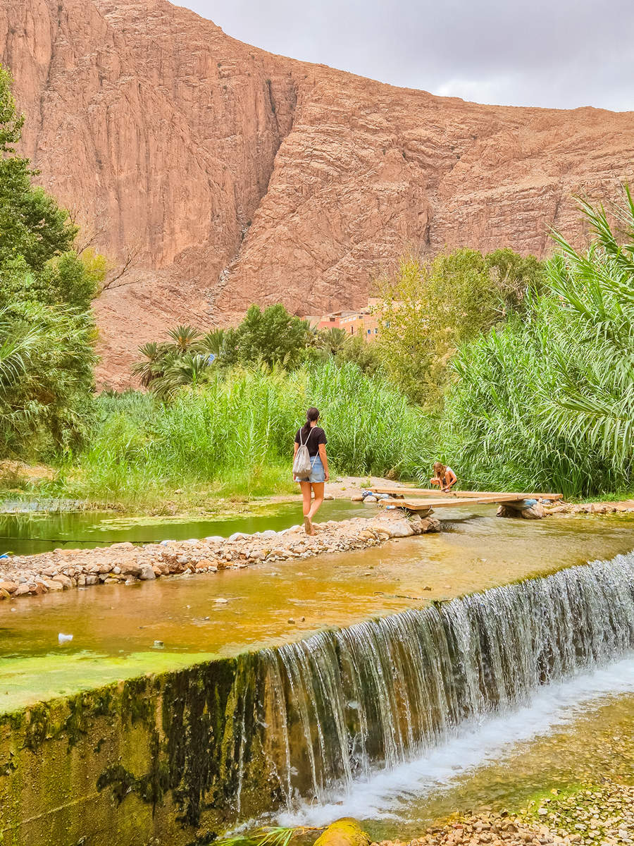 Interessanter Fakt: Am hinteren Ende der Schlucht entspringt der Fluss selbst. Neben einem alten, heute ungenutzten Hotel kannst du mit eigenen Augen sehen, wie das Wasser aus mehreren kleinen Quellen zwischen den Steinen nach oben sprudelt. Viele Marokkaner füllen dort ihre Trinkflaschen direkt an der Quelle auf – ein eindrucksvoller Anblick!