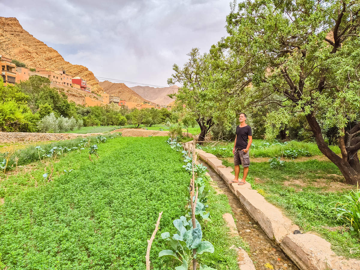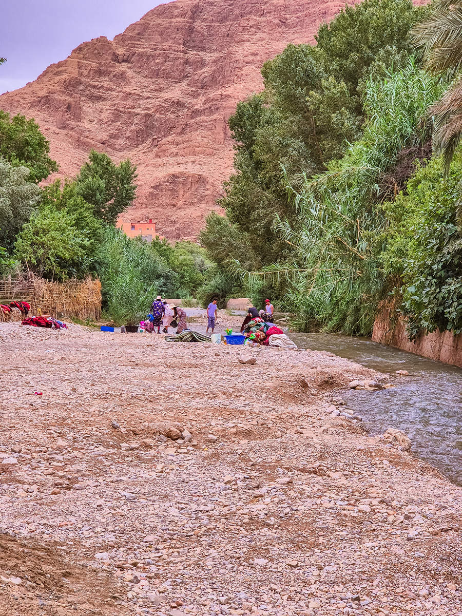 Von vielen Unterkünften gelangst du direkt zu den grünen Gärten entlang des Flusses. Hier bekommst du einen intensiven Einblick in das traditionelle Leben im Todgha-Tal: Männer bewirtschaften ihre kleinen Felder, Kinder spielen im Wasser, Frauen waschen ihre Teppiche und Kleidung im Fluss (leider mit normalem Waschmittel).