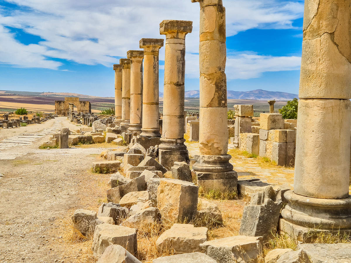 Wer Fès besucht, sollte unbedingt einen Abstecher zur antiken Stadt Volubilis einplanen. Die Ausgrabungsstätte liegt rund eineinhalb Stunden Fahrt von Fès entfernt und gehört zu den eindrucksvollsten historischen Orten Marokkos. Seit 1997 zählt sie zum UNESCO-Weltkulturerbe und gilt als eine der am besten erhaltenen römischen Stätten in Nordafrika.