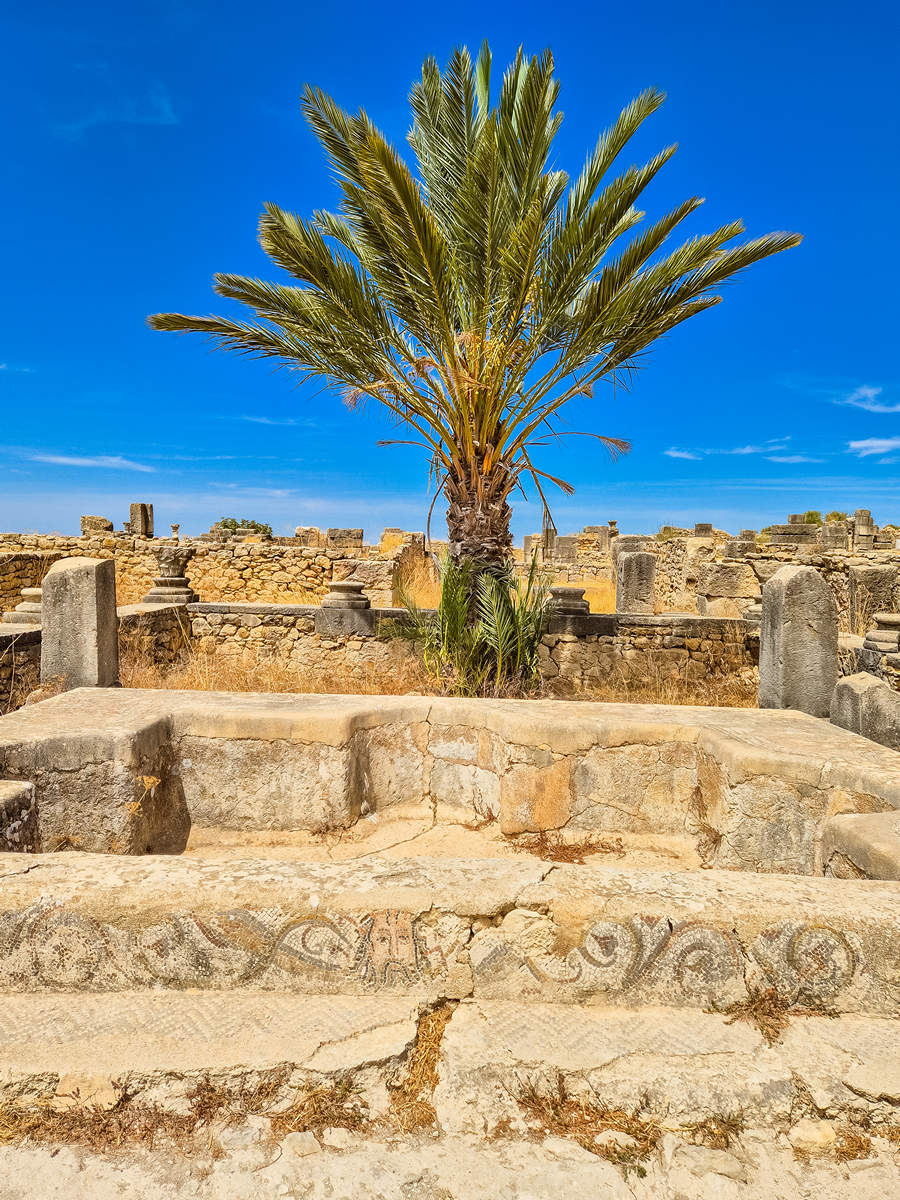 Dieses Haus unterscheidet sich von den anderen Villen in Volubilis, denn hier standen nicht prachtvolle Bodenmosaiken im Mittelpunkt, sondern kunstvoll angelegte Wasserbecken. In diesen Becken saßen die Gäste, während aus einem Springbrunnen in der Mitte Wasser emporschoss. Die Strahlen massierten Schultern und Rücken – eine Art römische Wellness-Oase. Am Rand der Becken kannst du dennoch Mosaikreste entdecken, die Nixen und Fische darstellen und so das Thema Wasser kunstvoll aufgreifen. Dieser Ort zeigt, wie sehr die römischen Eliten in Volubilis Genuss und Entspannung miteinander verbanden.