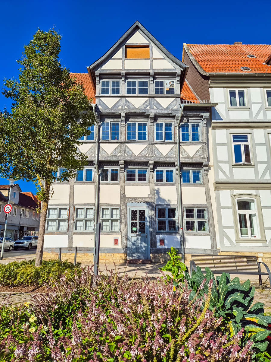 - Harzstraße 1: Ein wunderschönes Fachwerkhaus mit einer weiß-grauen Fassade und mit Wappen über dem Torbogen.